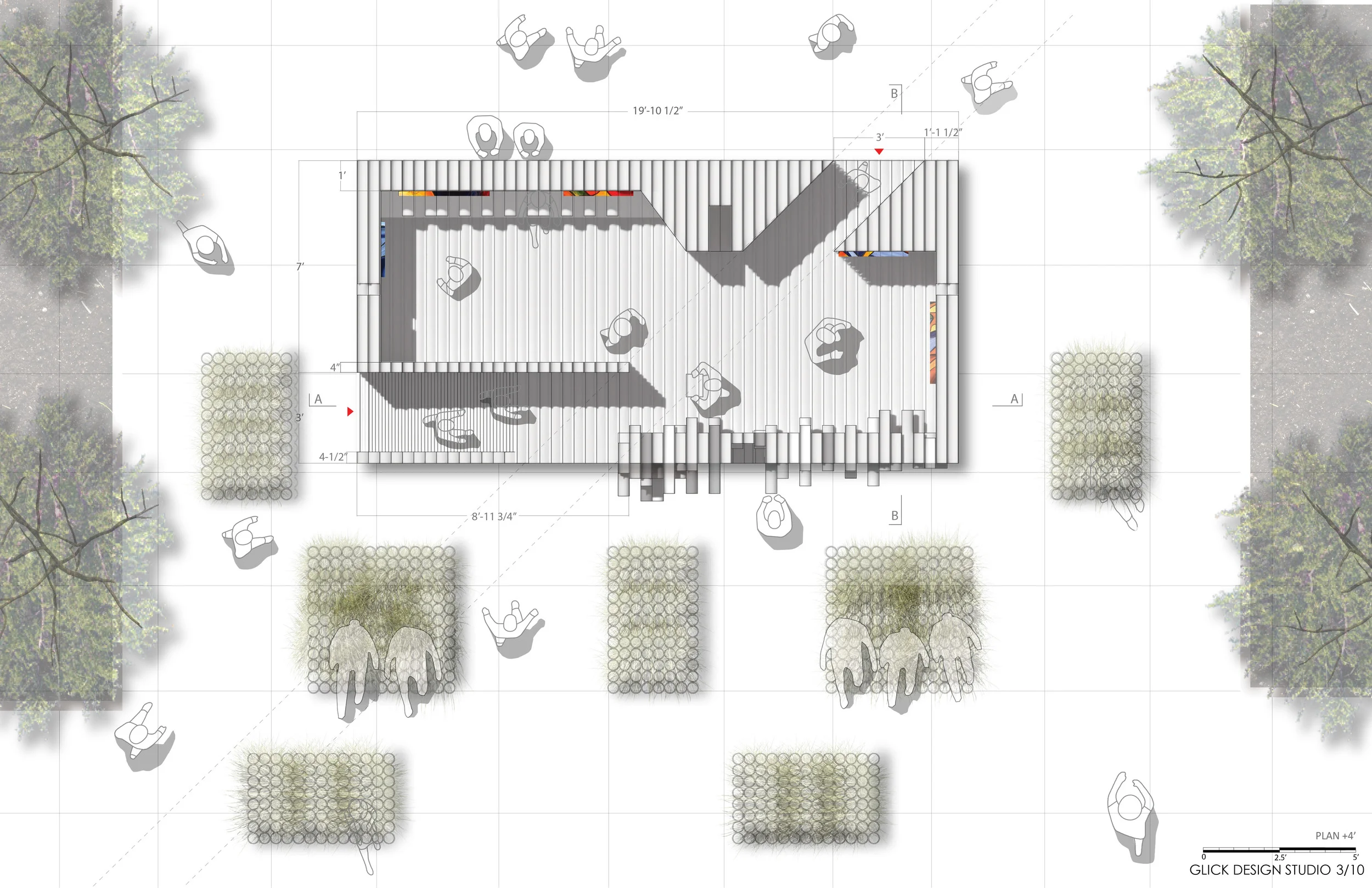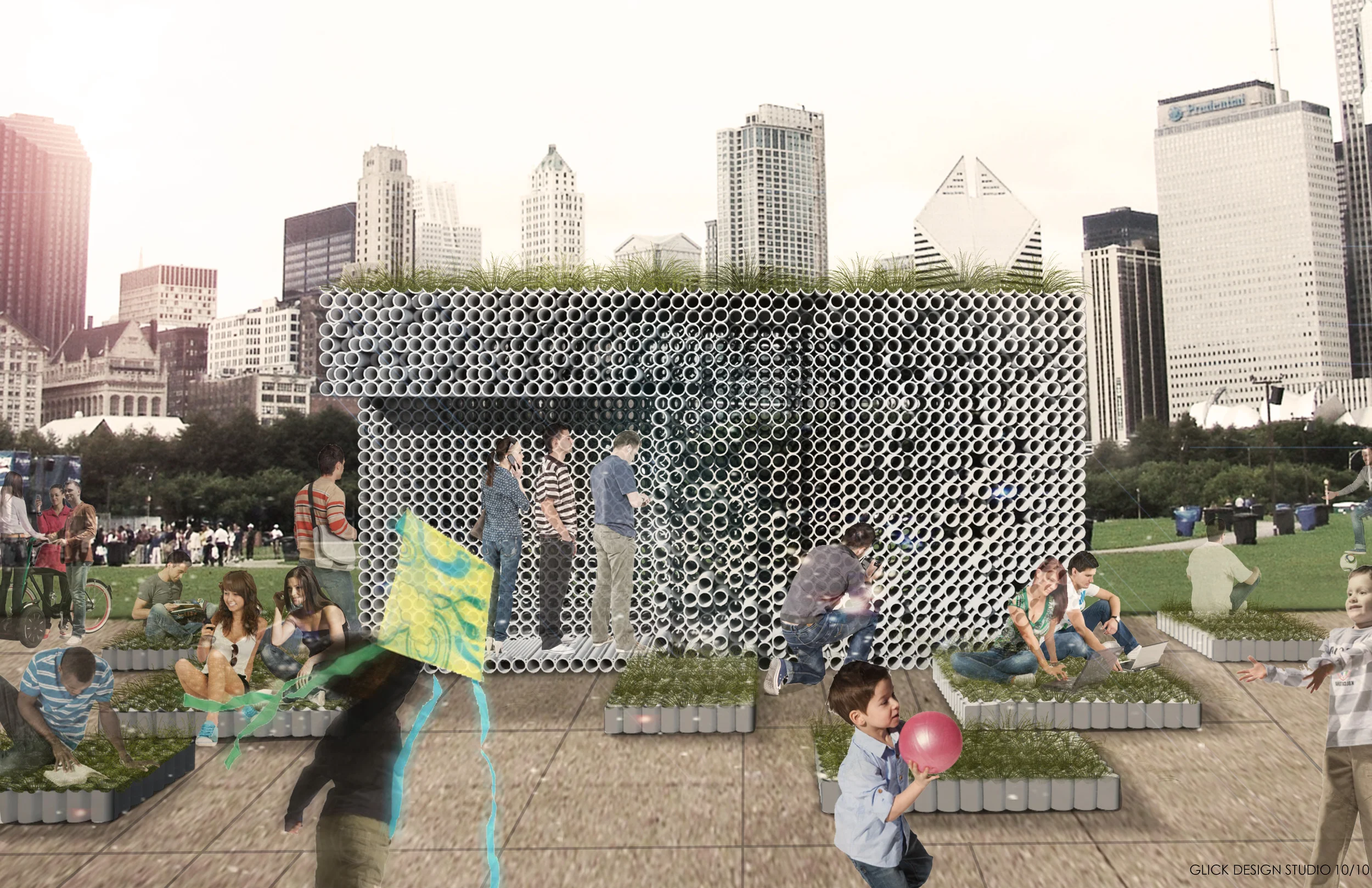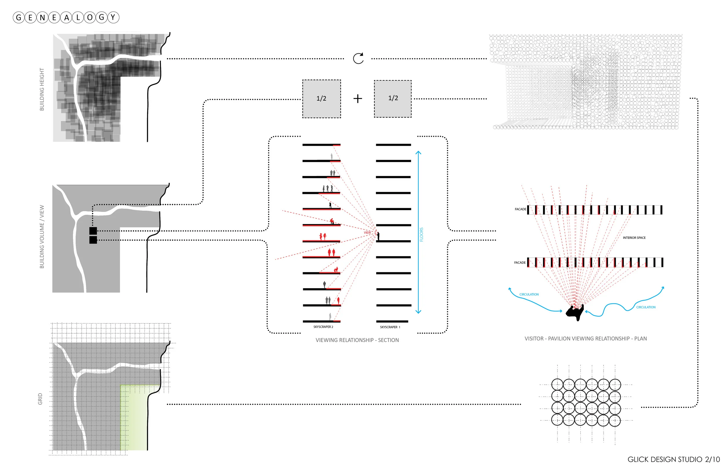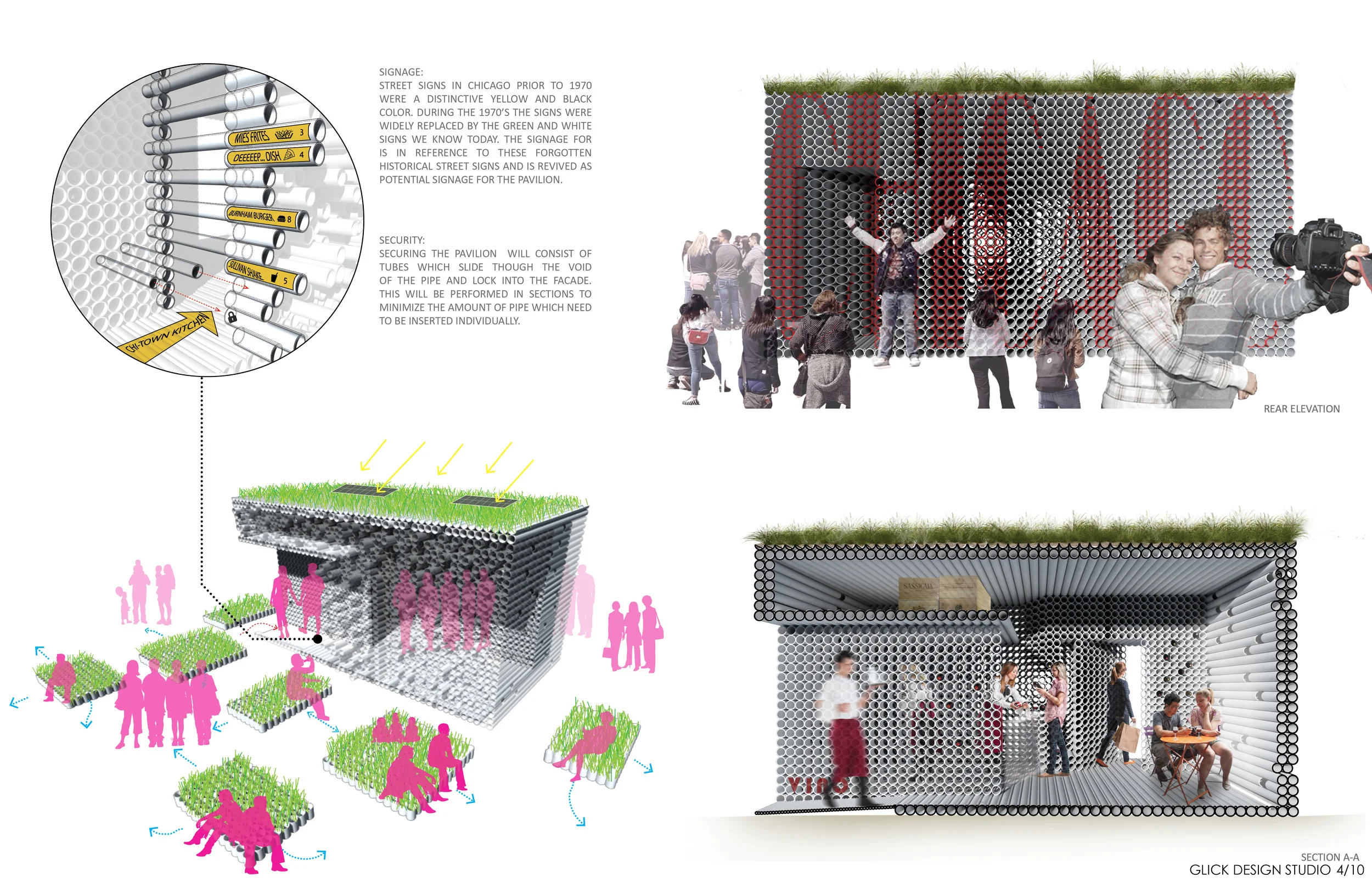 Description: Allowing Chicago’s formal and programmatic qualities to be the driver of conceptual backing for design decisions formulates a direct relationship between the city and a pavilion latent with contextual relevance. Purposefully challenging the pavilion to not be a random exercise in volumetric gymnastics charges the structure to respond to questions of relevance and origination. The pavilion can be defined as a conceptual microcosm of the city it resides in. Derived from the Chicago plan the pavilion utilizes conceptual mapping of building heights and density, the city grid, building volume, and viewing relationships to achieve a transparency both literal and phenomenal. Transparency changes constantly unveiling enumerable densities and implied transparencies of which the visitor is critical to- without this factor the transparency becomes meaningless. Transparency forces ambiguity to unlock a unique experience for each visitor who literally or phenomenological sees something different…