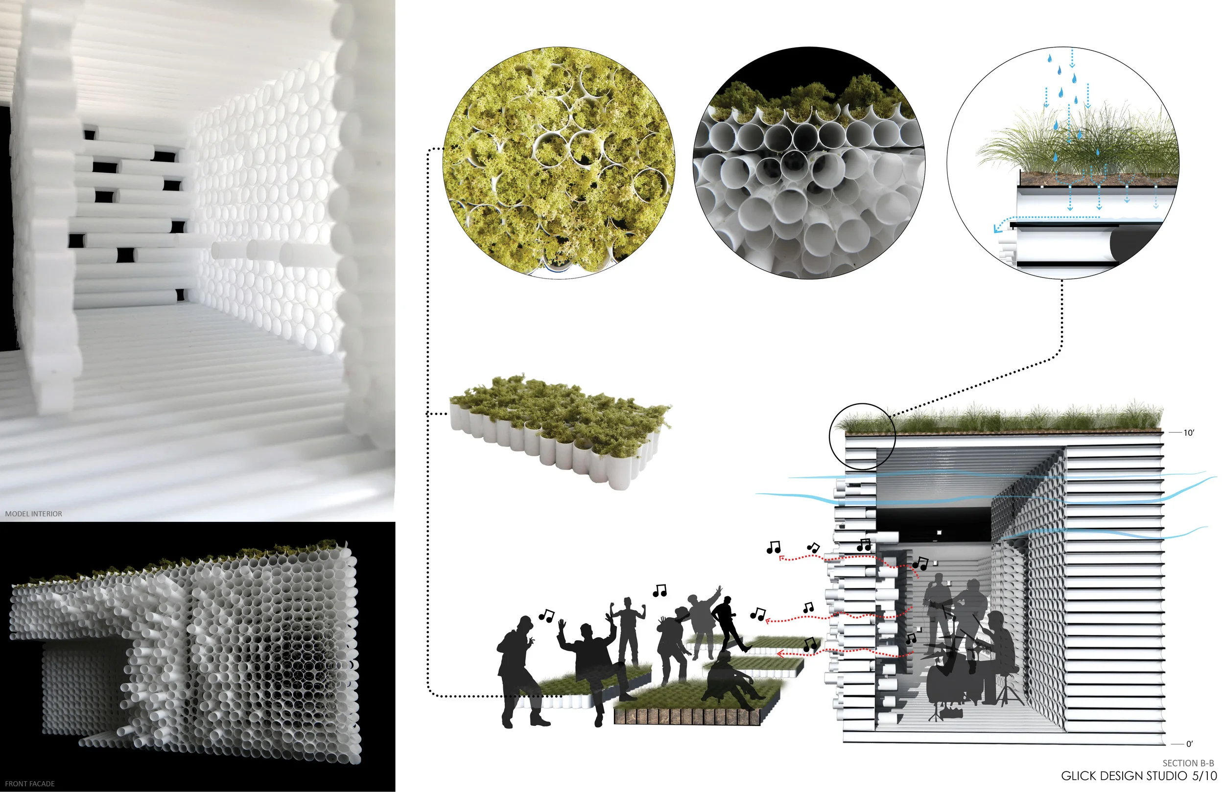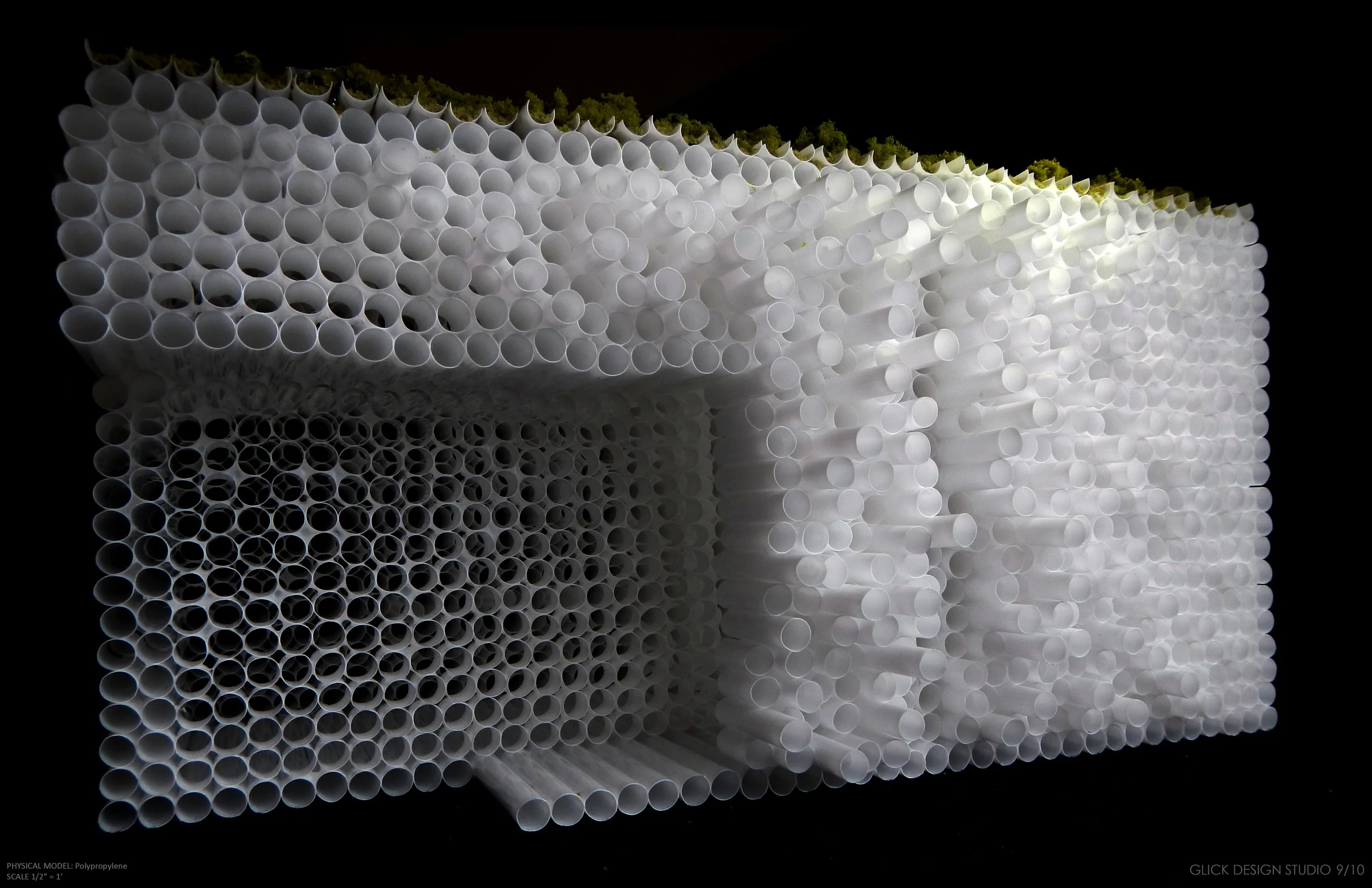 The power of compressing depth into a superimposed spatial condition puts forth questions of transparency in the built environment. Through the pavilions façade distortion and purposeful misunderstanding of space provides visitors with a consistently changing experience. While visitors can literally see thorough the façade when standing perpendicular to it, its implied form can be ghostly seen though the varying depths of the façade. These phenomenological forms consistently change as the visual porosity changes. Forms appear lighter when viewed through a portion of the façade which is shallow, while darker when tubes have greater depth. György Kepes in his text “Language of Vison” defines transparency though the following, “If one sees two or more figures overlapping on another, and each of them claims itself the common overlapped part, the one is confronted with a contradiction of spatial dimensions. To resolve this contradiction one must assume the presence of new optical quality. The figures are endowed with transparency” that is, they are able to interpenetrate without optical destruction of each other. Transparency however implies more than an optical characteristic; it implies a broader spatial order. Transparency means a simultaneous perception of different spatial locations. Space not only recedes but fluctuates in a continuous activity. The position of the transparent figures has equivocal meaning as one sees each figure now as the closer, now as the further one.” While the transparency of the façade is in fact physically void, this definition champions the clear ambiguity which is a purposely evoked design outcome. The hollow pipe allows visitors to have a consistently changing experience while moving in and around the pavilion. Conceptually conceived through the slab-like sectional relationships of the Chicago skyscraper, views from one building to another are limited by the floor above or below. Only when occupants look directly across to another floor of equal height can a theoretically transparent view be achieved. Taking this concept from building section, the pavilion utilizes the same concept in plan. Only when a viewer physically addresses the pavilion in a directly perpendicular relationship, can the view through the pavilion be achieved. Even as this is achieved, perspective superimposes the opposite facades together along with phenomenal form and densities. As visitors move around, toward, and away from the structure the cloud of transparency changes unveiling programmatic movement, phenomenological form, and synapses of color and activity. Only when moments when color, implied form, and literal transparency occur simultaneously does the presence of the two orders of transparency become evident. Transparency changes constantly, unveiling enumerable different densities and implied transparencies, the reliance of the visitor is the key to this ever changing condition as without this factor the transparency becomes meaningless.