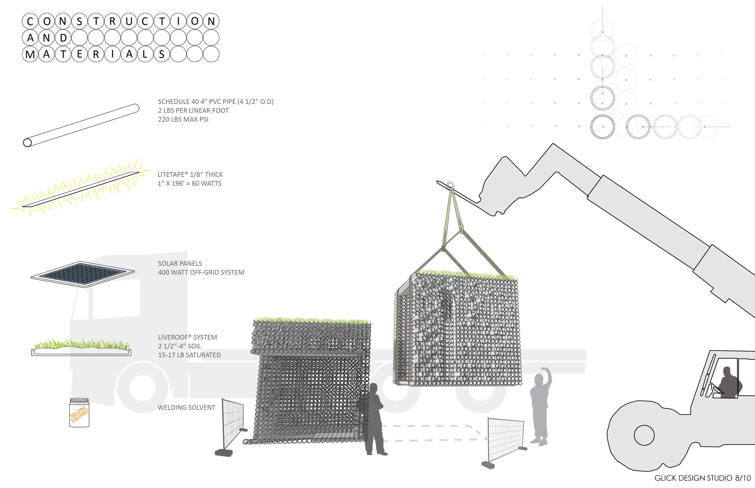 Utilizing the plan of the city in elevation provides a metric for extrusion distance of the front façade. The varying distances of extrusion respond to the diversity of buildings heights in elevation. Thus, taking the elevation of city and reorienting to plan operates as a creative misreading of the city’s formal and spatial qualities. While Chicago grid is a prevalent aspect of the identity of Chicago, this grid is reinforced by the orthogonal buildings which are bound to its systematic logic. Utilizing this concept in two elevations makes visible an abstracted grid not otherwise seen from the air. Utilizing the cylinder as a surrogate for building volume eliminates the rectilinear “hard lines” and rather plays by the rules of an implied grid. The grid is implied through points of contact for each pipe with the next, as well as a center of each circle in elevation. These attributes and design decisions produce an architecture which is physically static while visually dynamic.