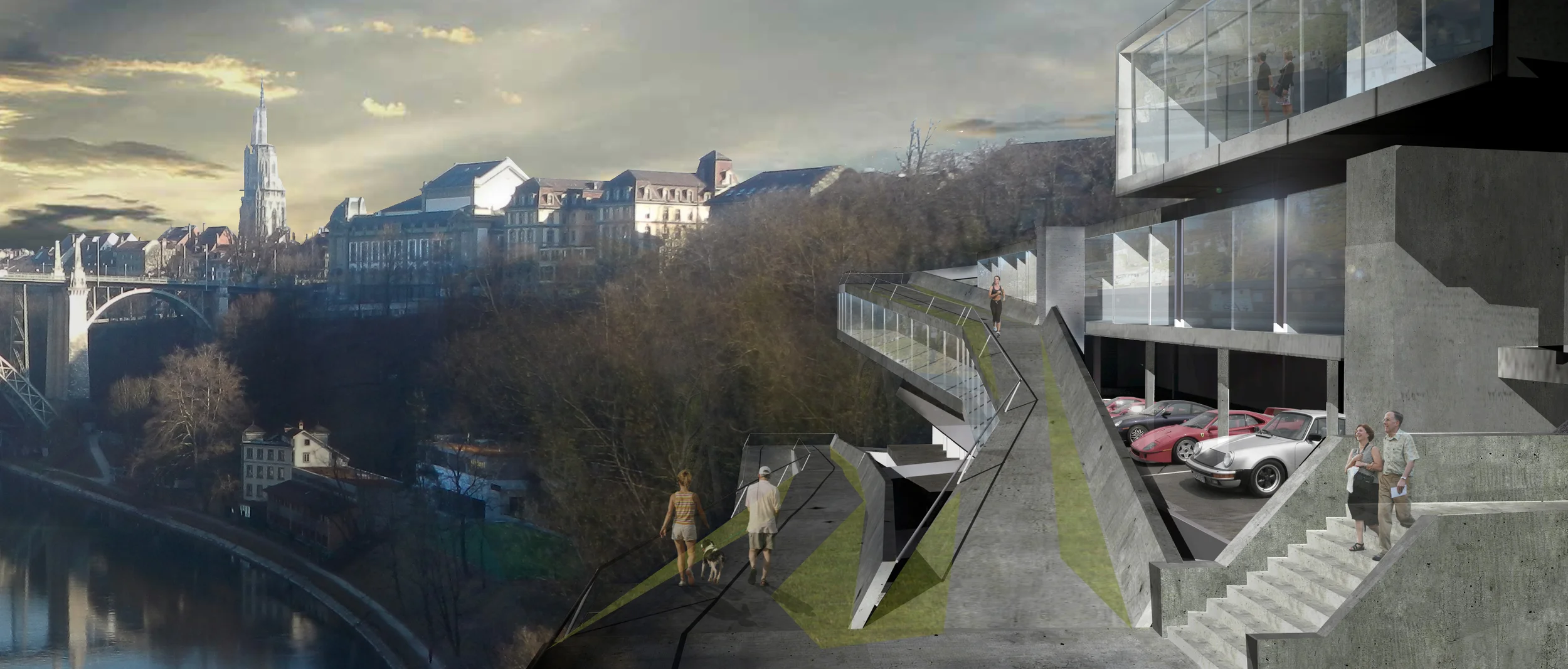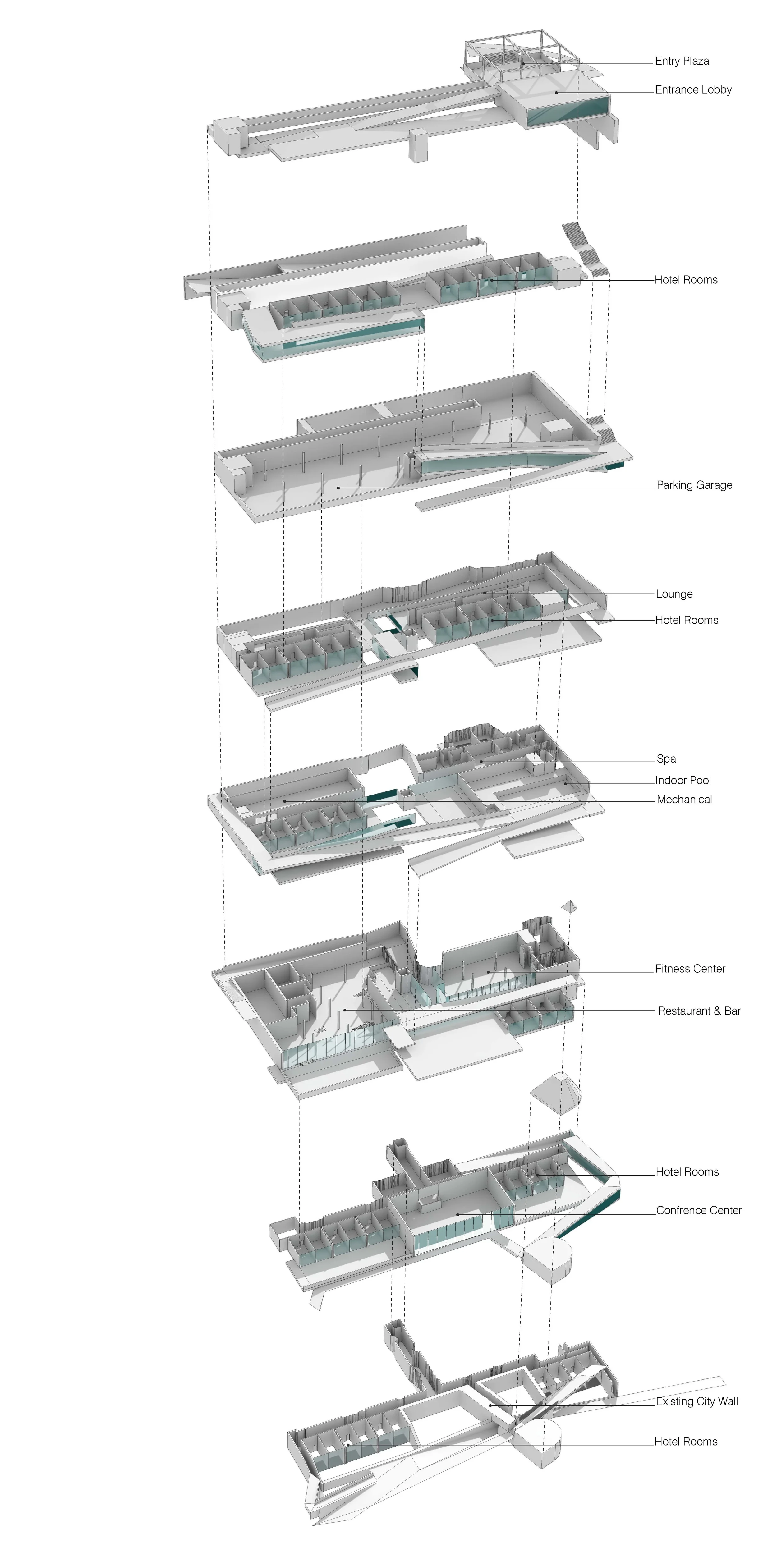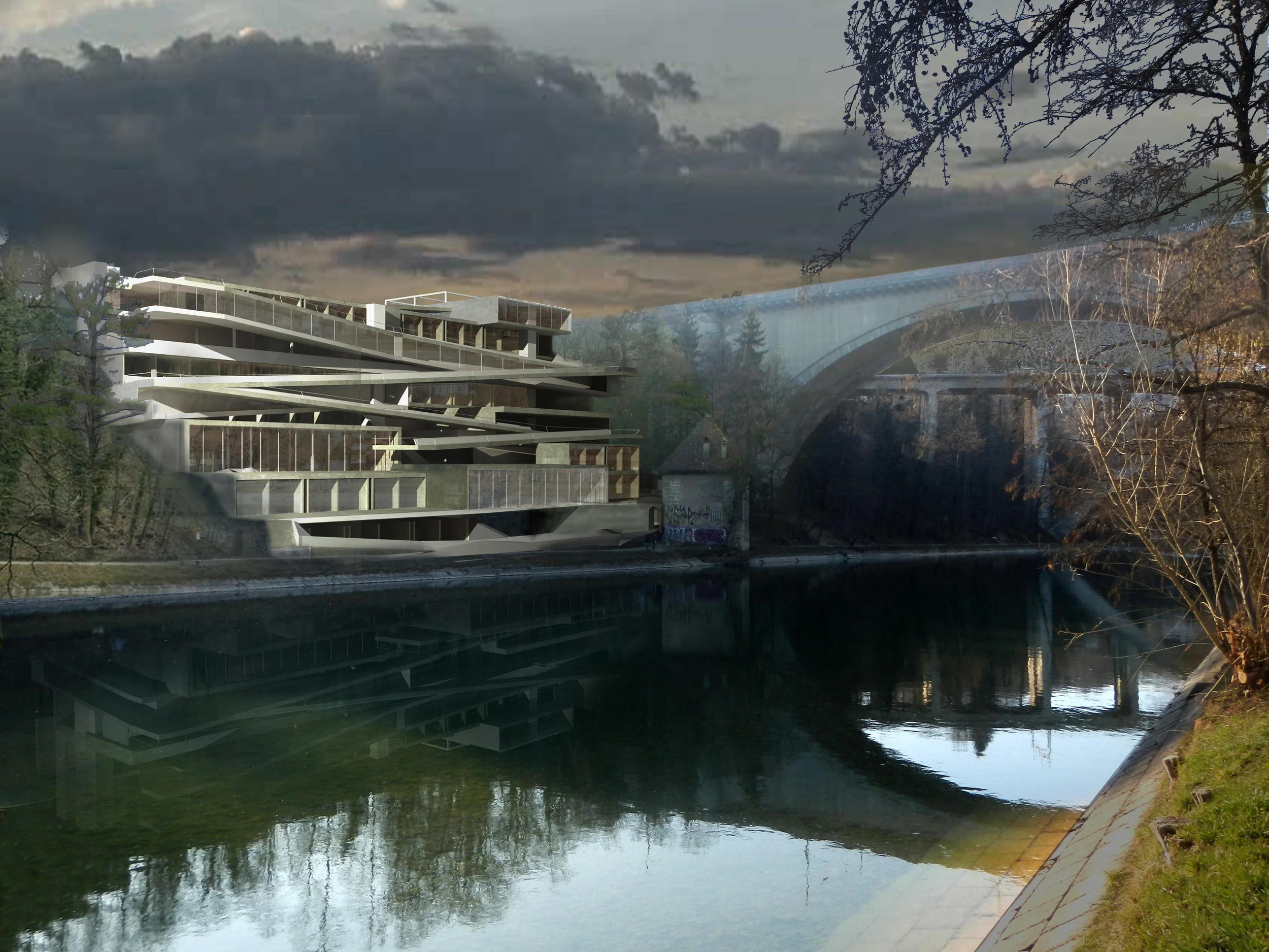 Description: Bridging the gap between city and water this hotel operates as a machine of accessibility for the public of Berne. Allowing the building to grow out of the landscape and utilize the natural rock face creates a symbiotic relationship between built and natural form.