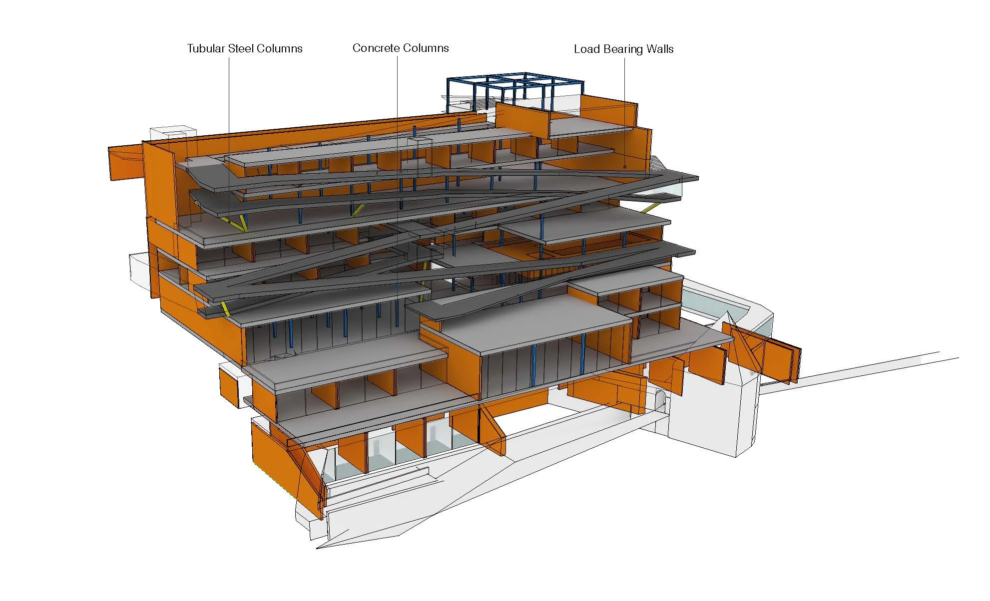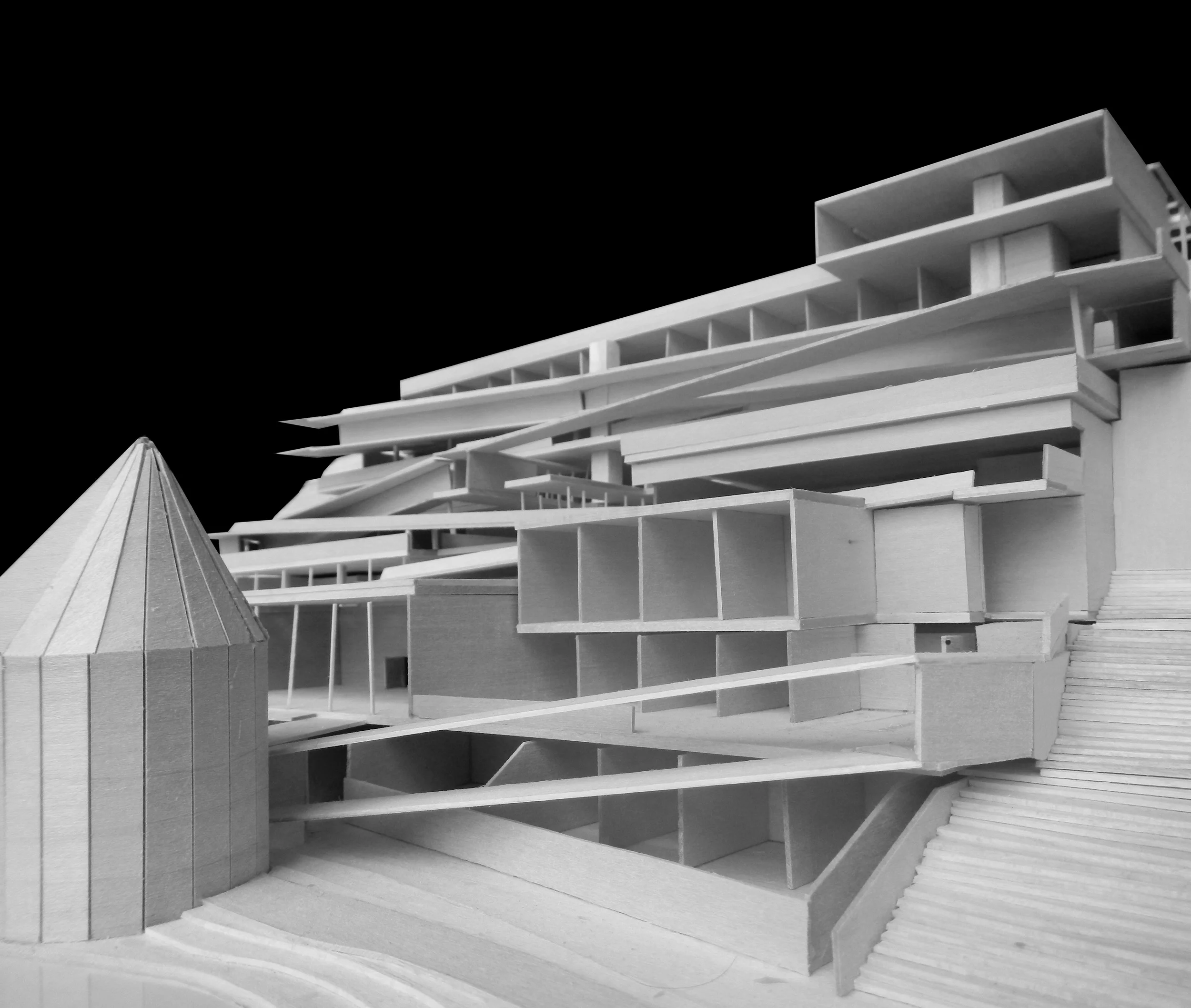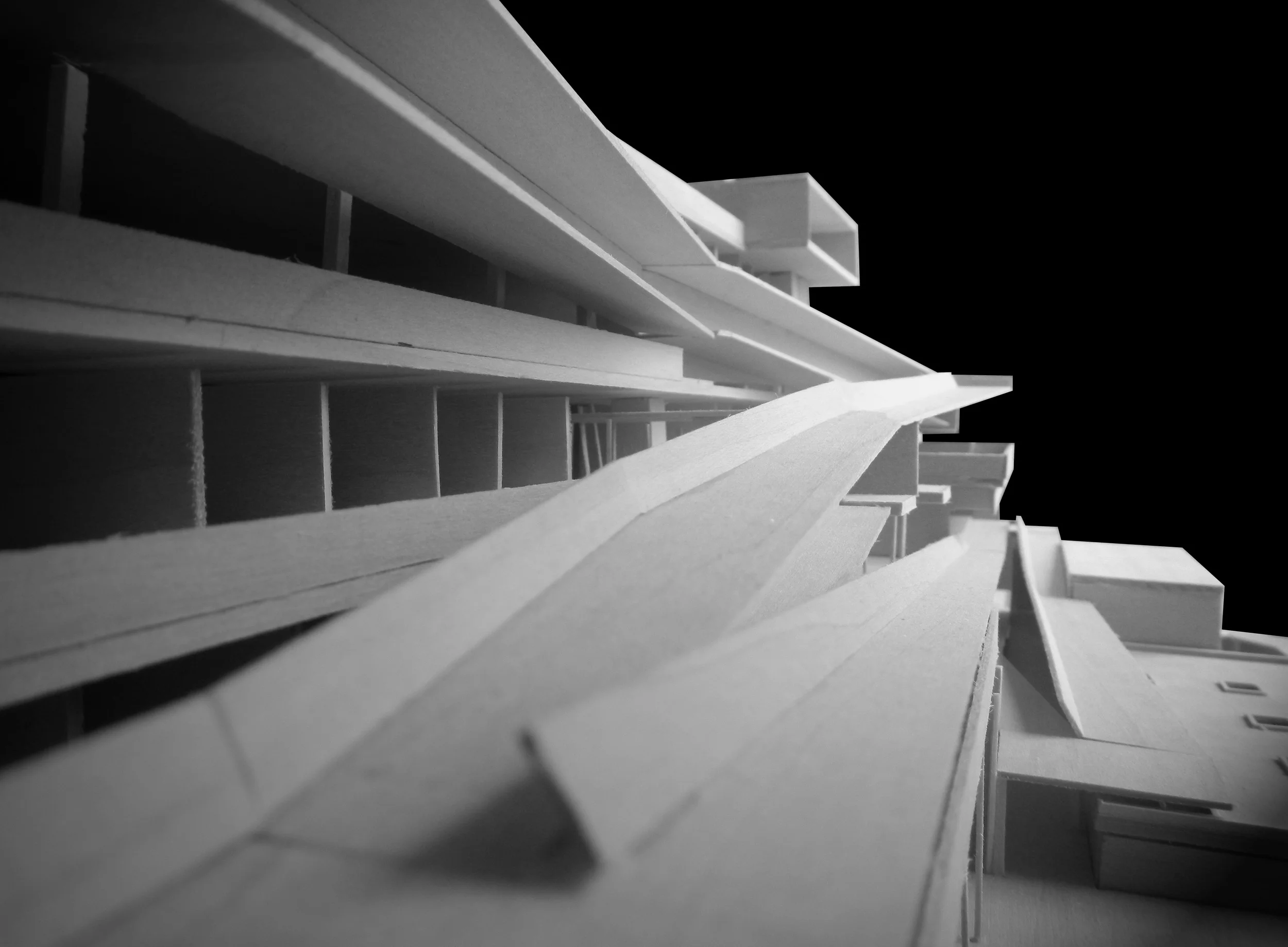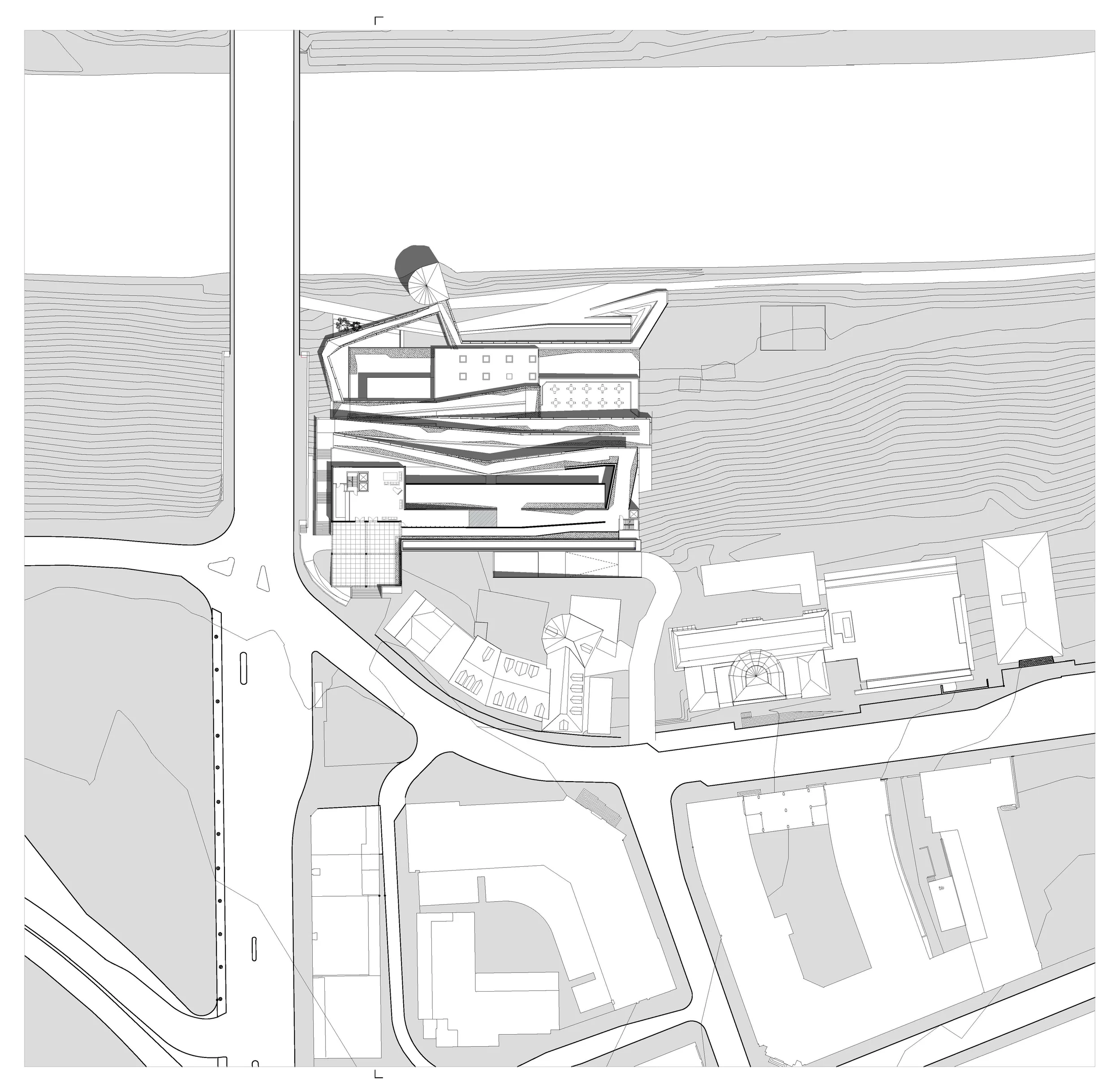 Description: Bridging the gap between city and water this hotel operates as a machine of accessibility for the public of Berne. Allowing the building to grow out of the landscape and utilize the natural rock face creates a symbiotic relationship between built and natural form.