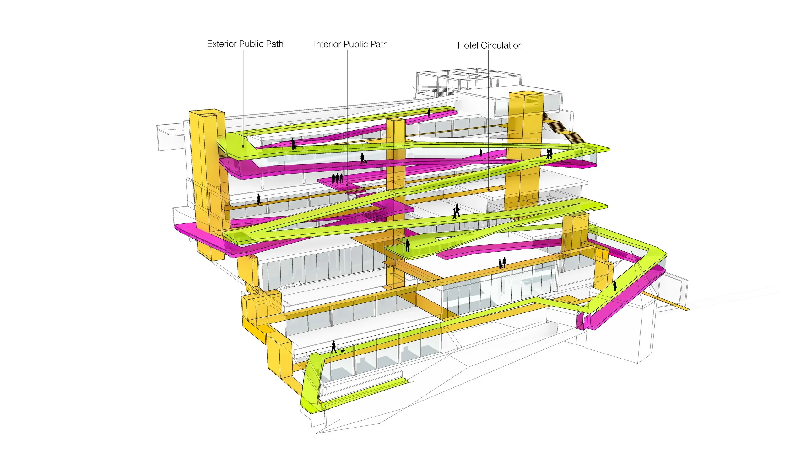 An exterior plaza adjacent to one of the busiest corners in Berne marks the entry to all three circulation paths. Separation between public and private is key to keeping a functioning hotel and conference center and a public circulation path with unrestricted access.