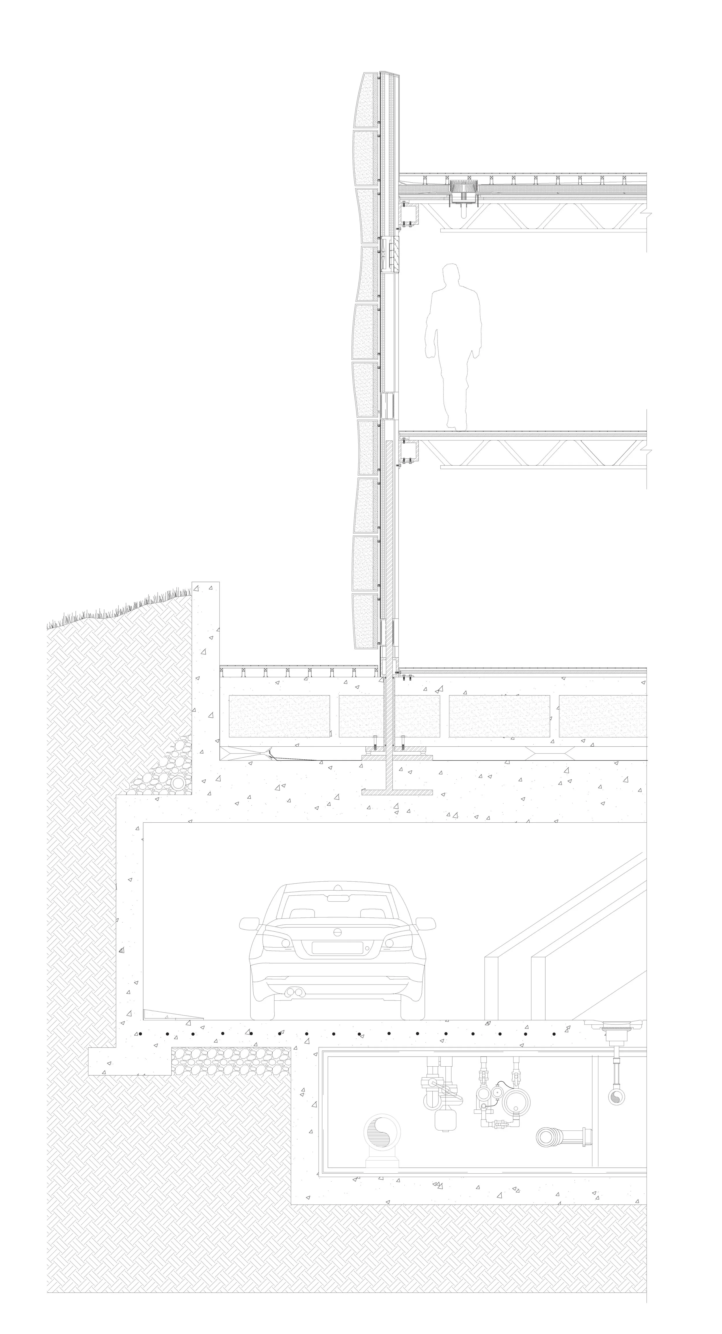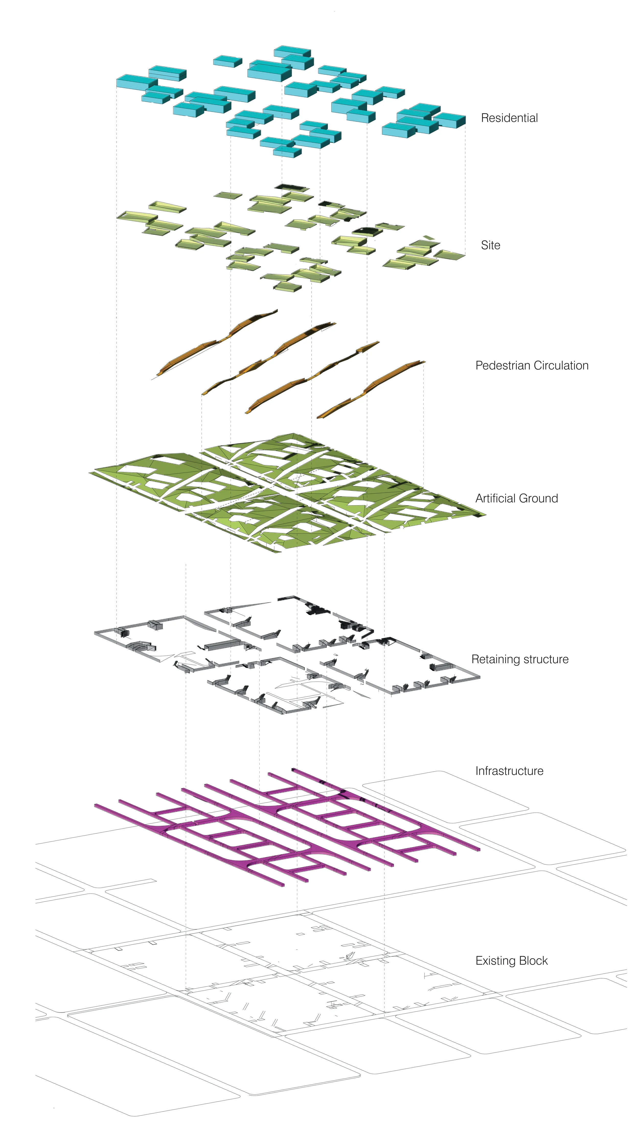 The development of a series of residential units which fit into a larger infrastructural framework, allowing for a multi phased response to rising water. A artificial ground serves as a plinth which acts as the first response to rising water. Infrastructure and vehicular parking are housed within the artificial ground.